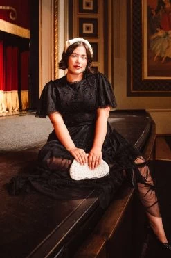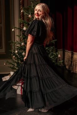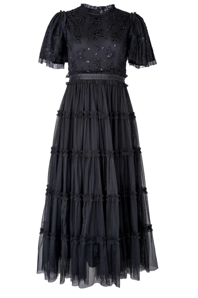 black beaded tulle flutter sleeve midi dress