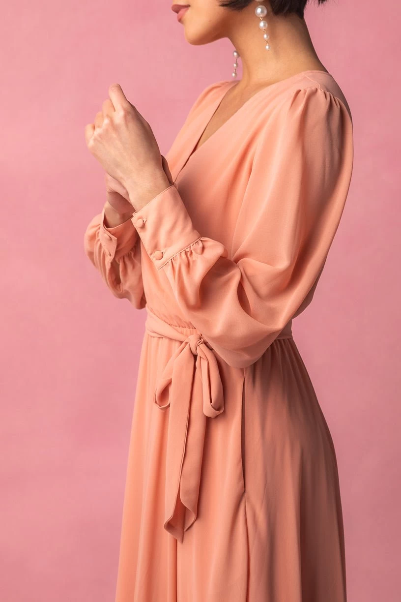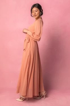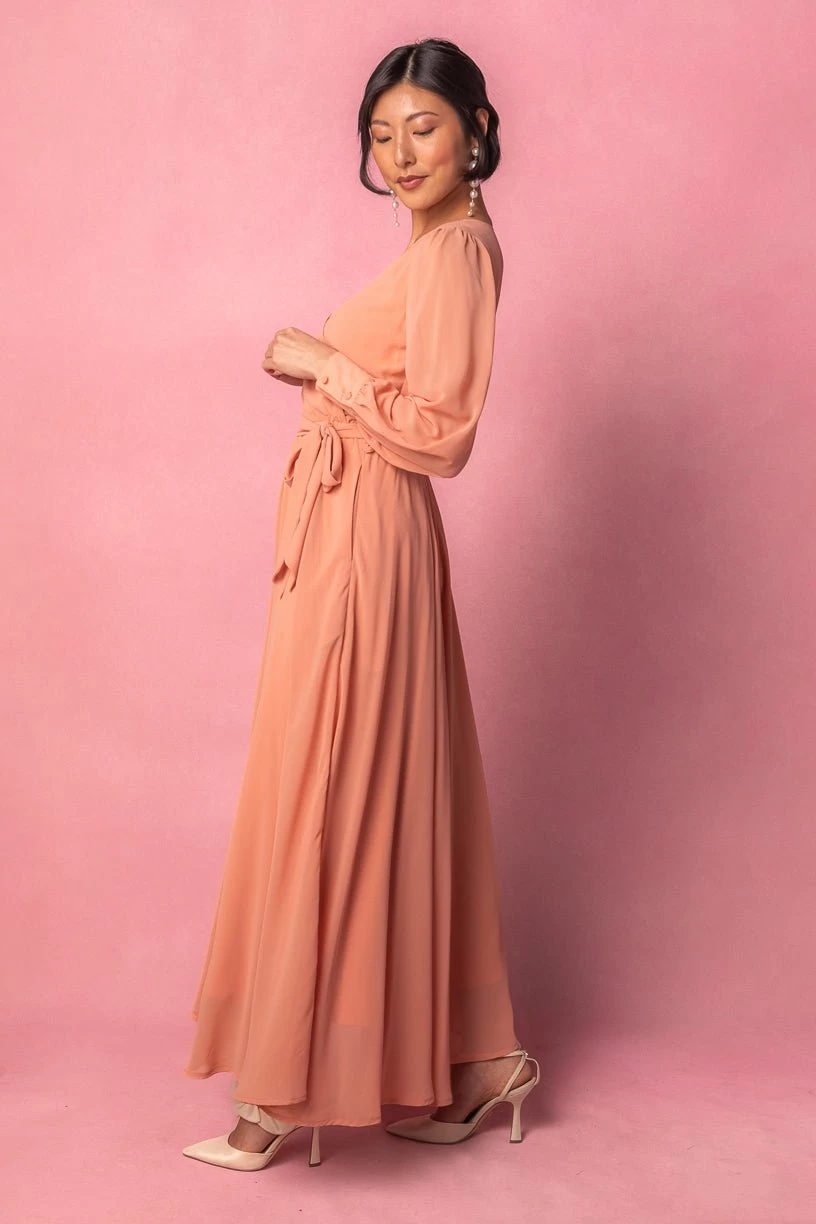 orange chiffon wrap long sleeve maxi dress