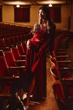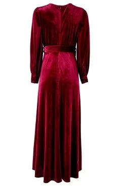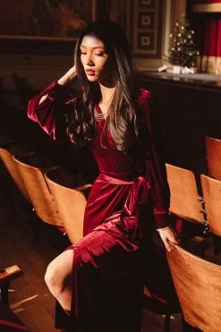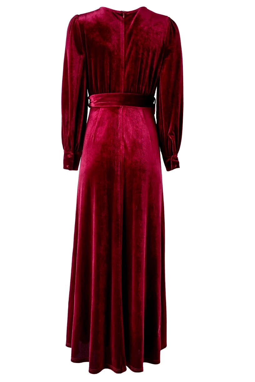 red velvet wrap long sleeve maxi dress