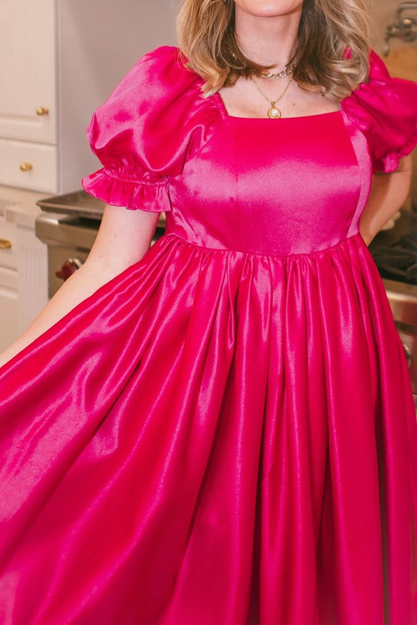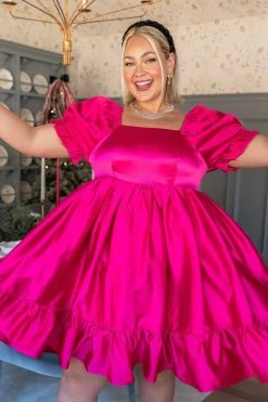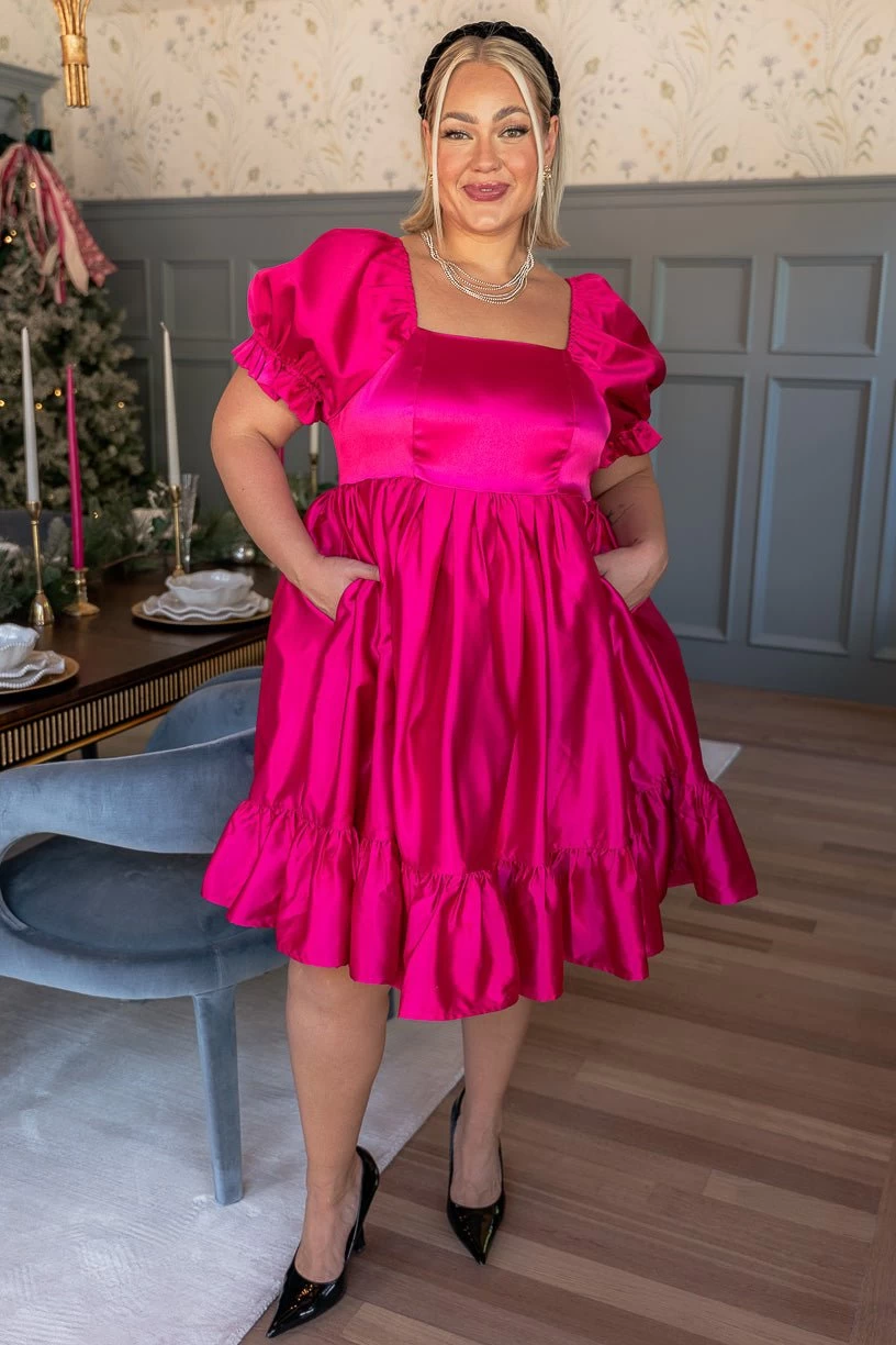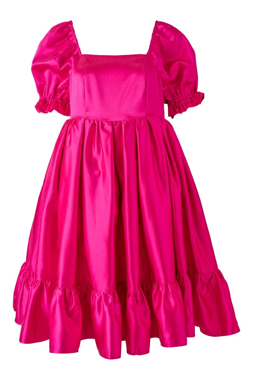 hot pink puff sleeve knee length dress