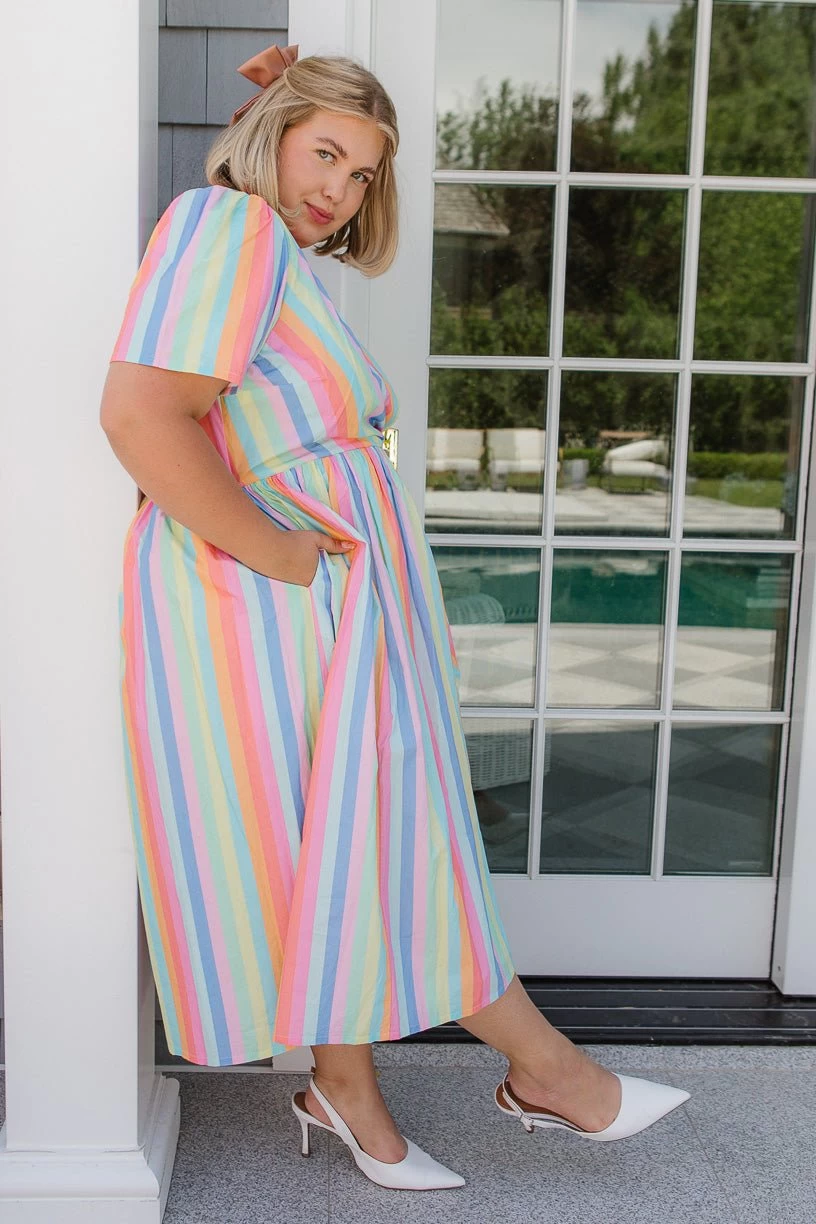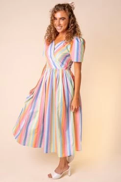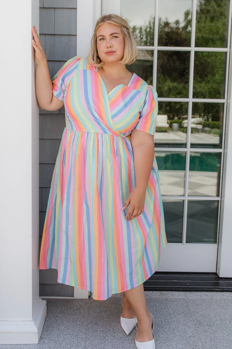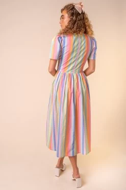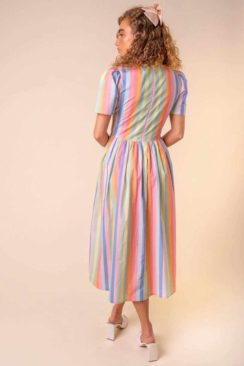 striped cotton sweetheart neckline midi dress
