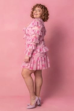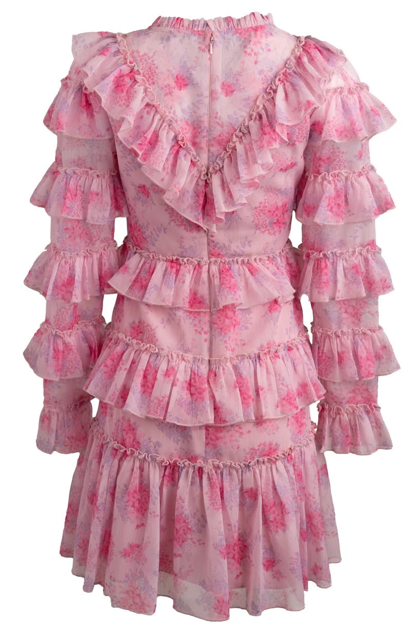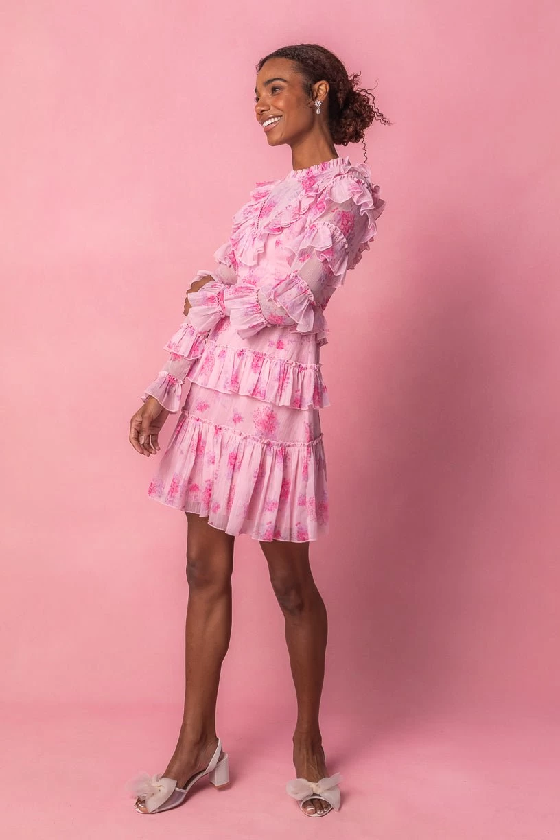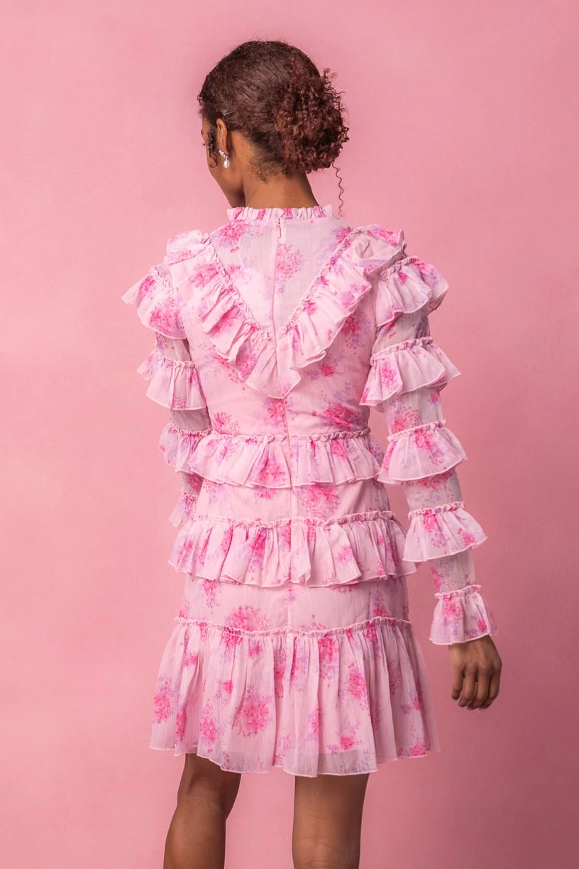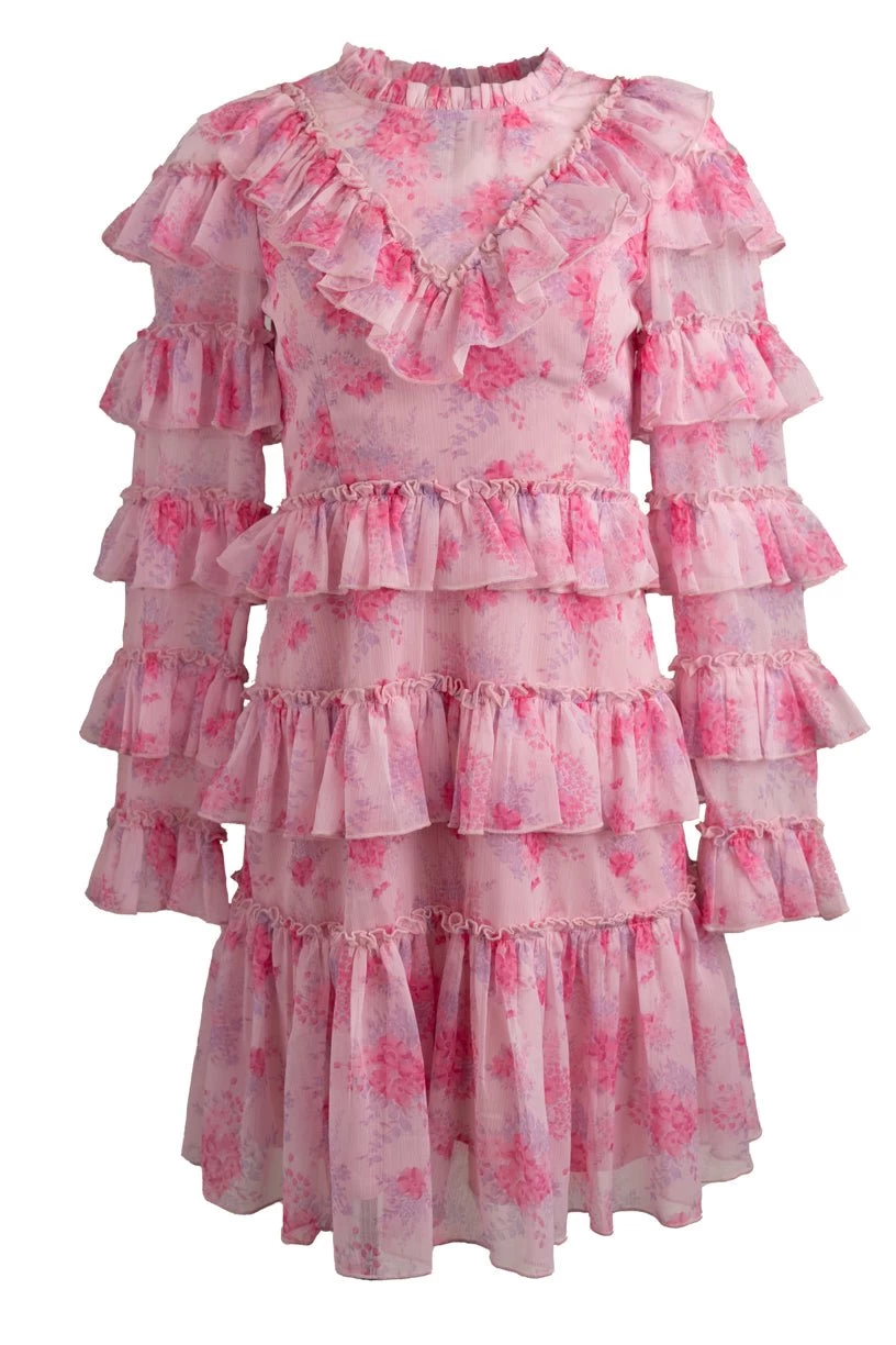 pink floral ruffled knee length dress