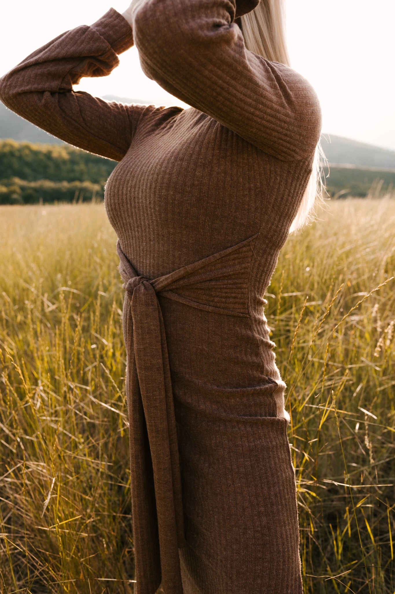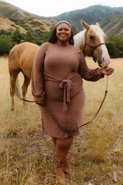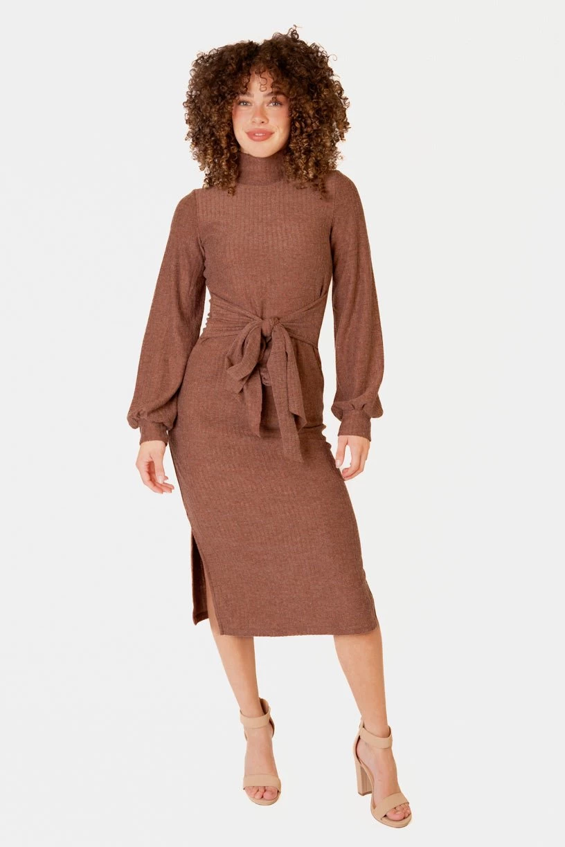 brown knit long sleeve midi dress
