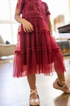 red beaded tulle flutter sleeve midi dress