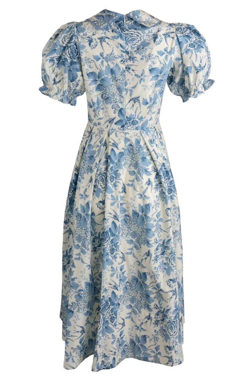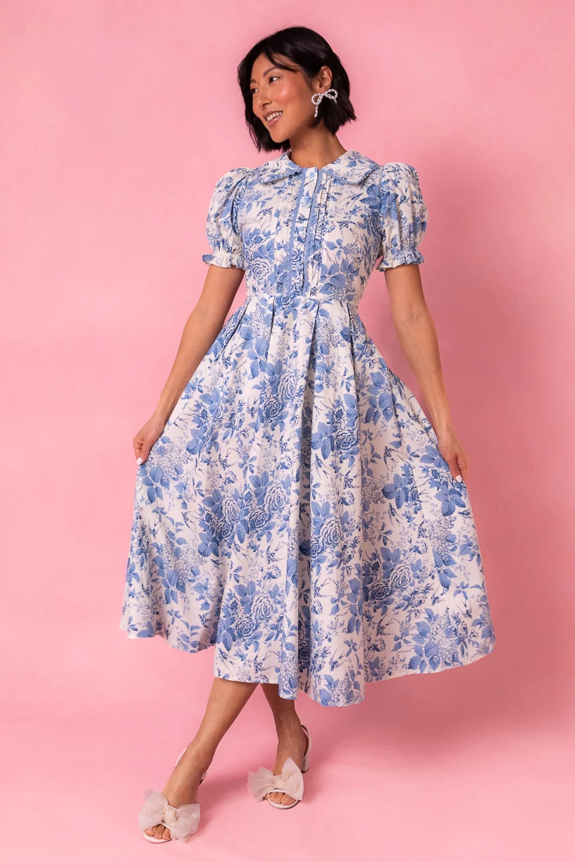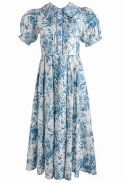 white and blue floral cotton midi dress